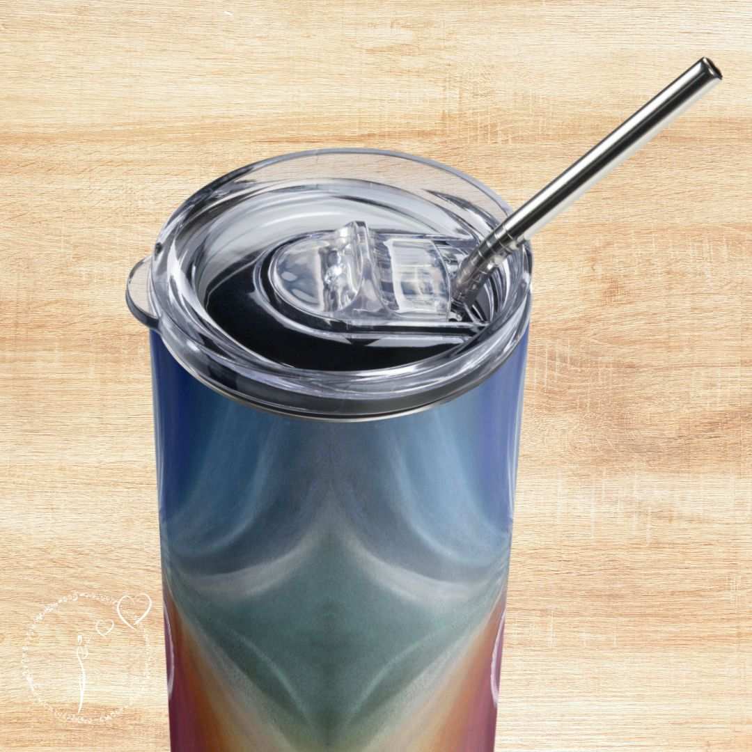 Un voyage à Bali m'a inspiré l'illustration du gobelet en acier inoxydable OM. D'après mon hôte, je séjournais dans une villa près d'Ubud lorsque le jardinier m'a dit avec un grand sourire : « Vous avez peint ma spiritualité ; on dirait le symbole OM ! » Je n'avais vu que la forme du cœur, mais grâce à ses mots, j'ai compris que ce dessin parlait de se recentrer sur son cœur.
