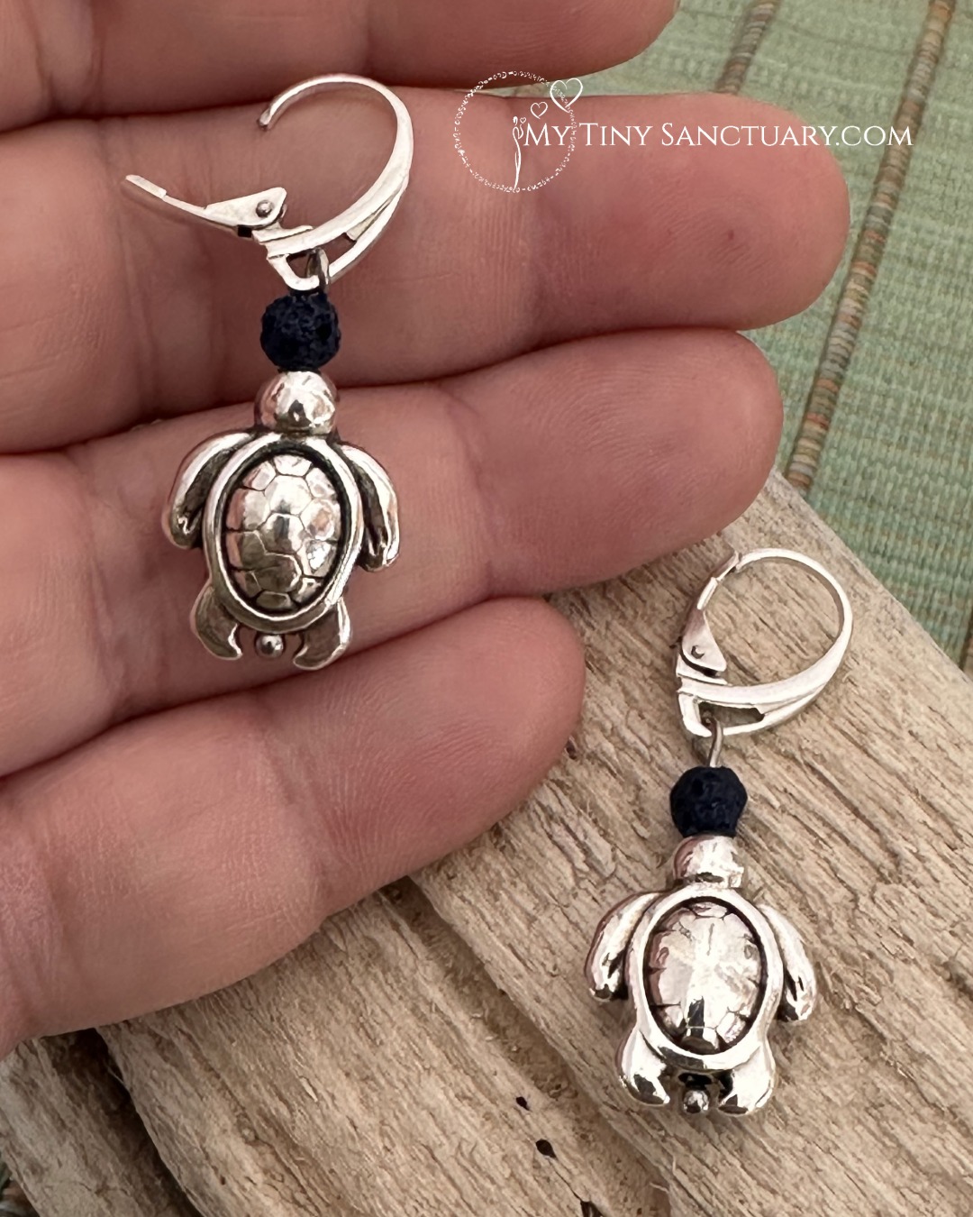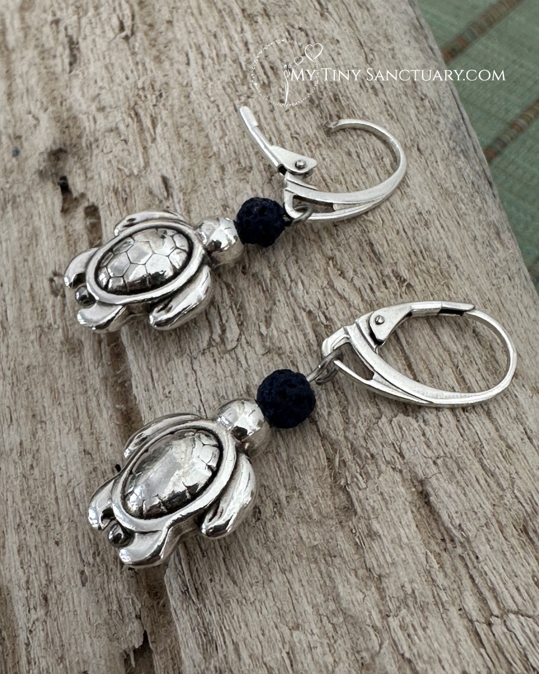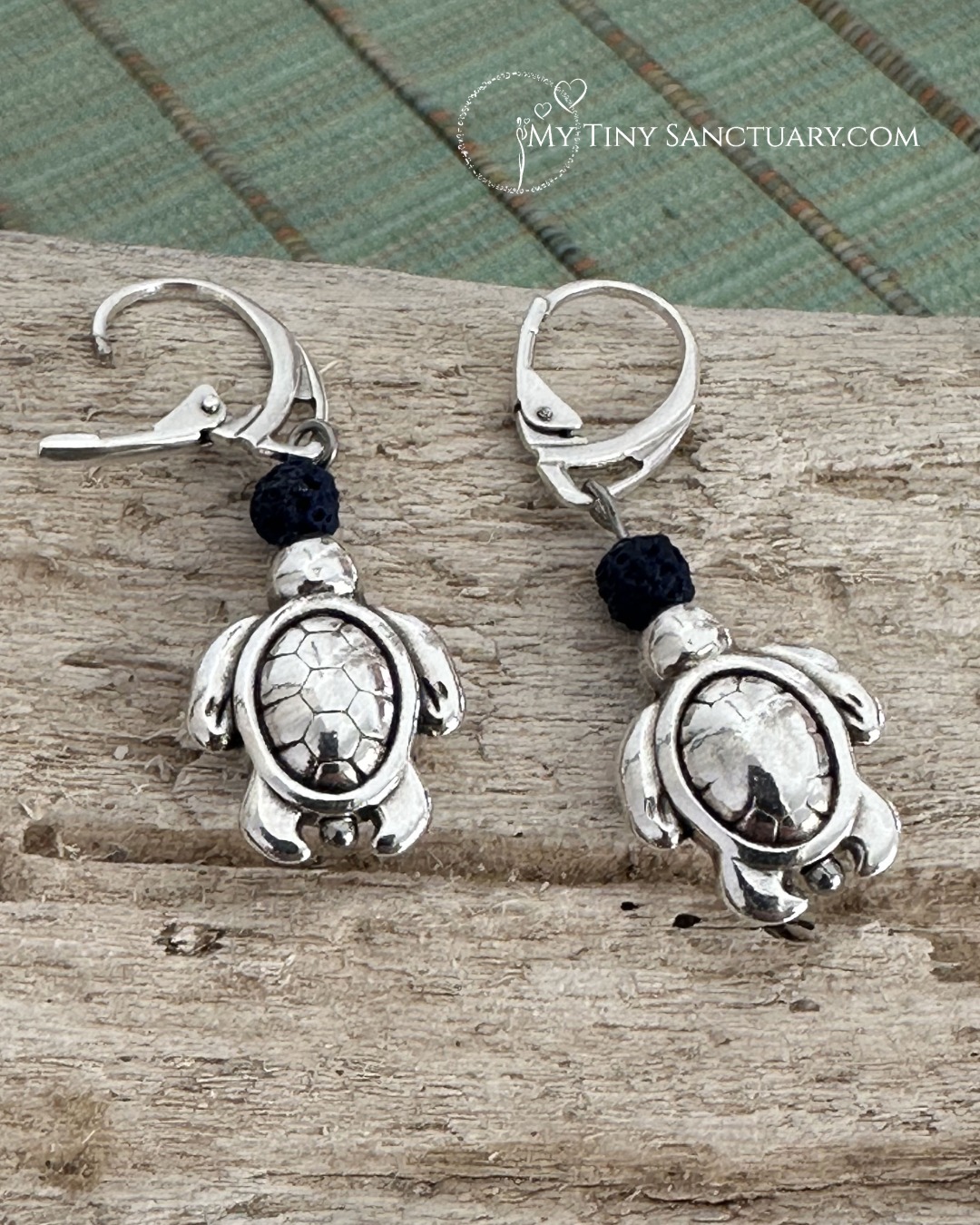 Turtle of Aegina Earrings | 999° Antique silver-plated & Lava Bead
