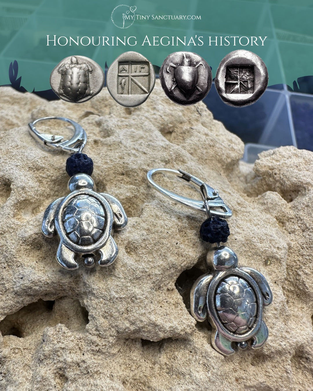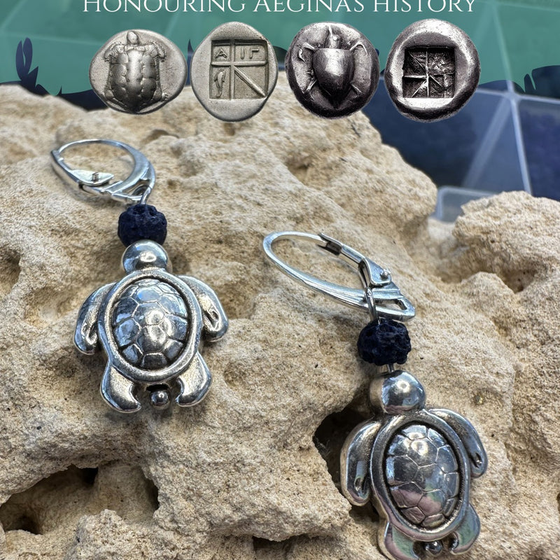 The Turtle of Aegina Earrings is a tribute to the island crest and one of her most ancient legacy: the turtle... and coins!